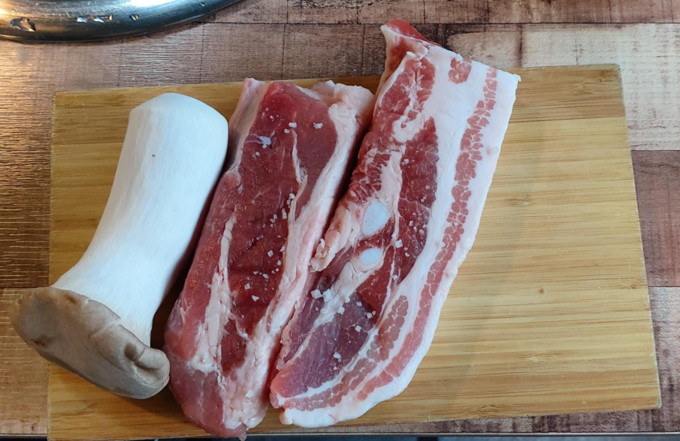 통삼겹이라 얇게 잘라서 올려 놓으면 됩니다. 가격이 비싸다는 생각이 들었는데, 아이 엄마가 먹으면서 연신 굳~~