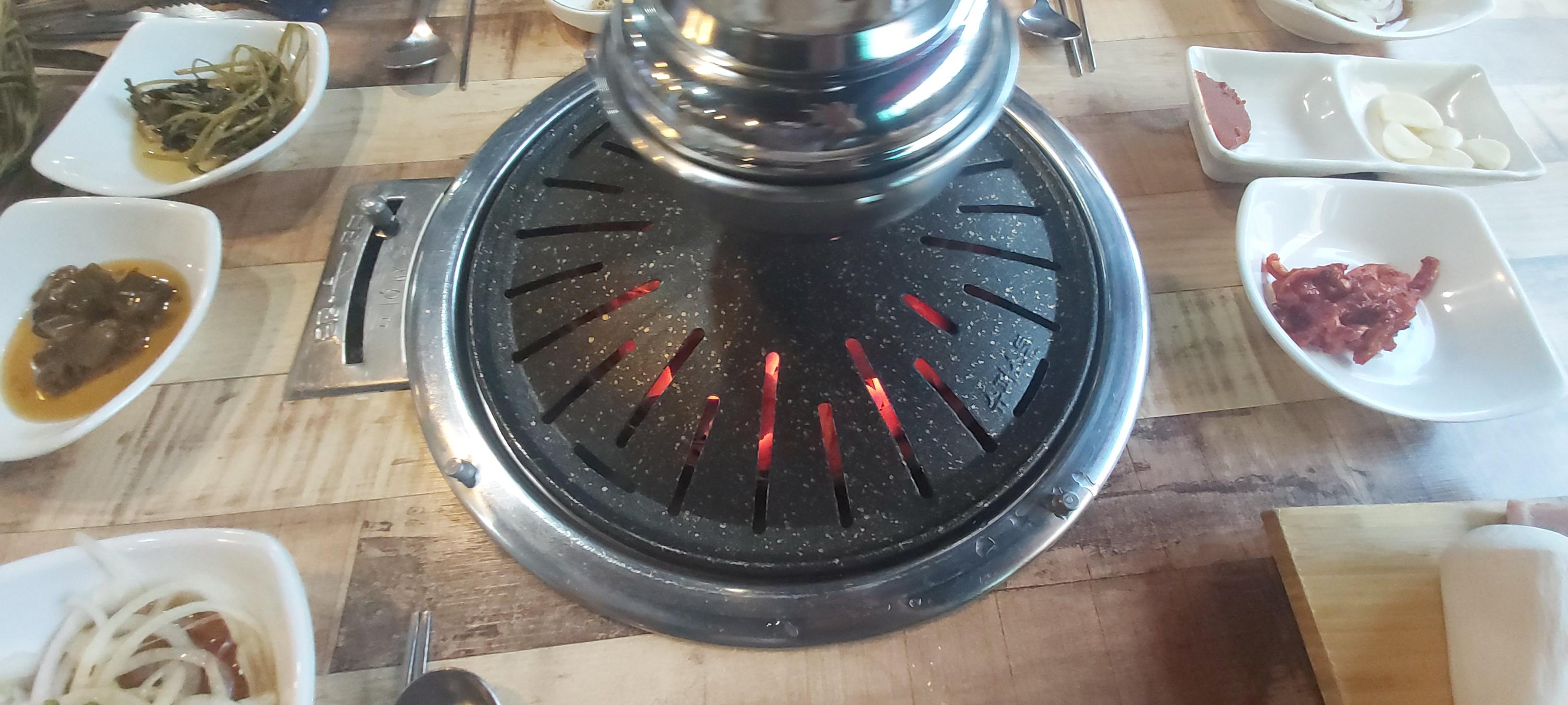 숯불 올려서 불판을 데워놓은 상태에서 고기를 올려놓으면 끝~~