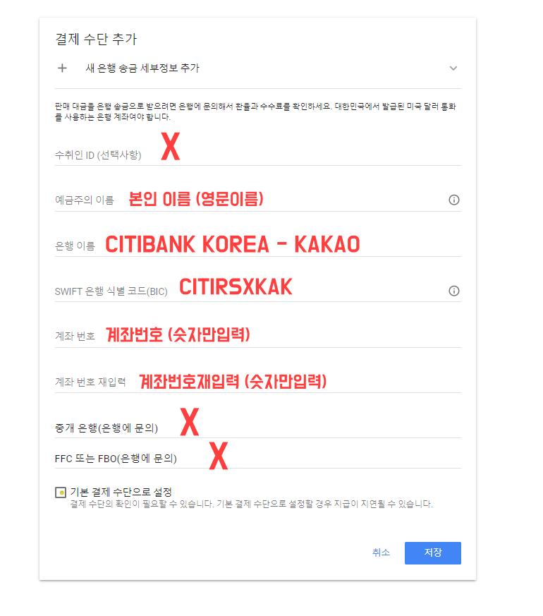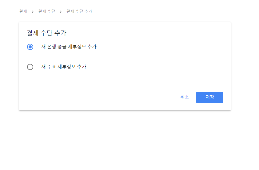 결제수단 추가에서 새 은행 송금 세부정보 추가 선택 하시면..창이 하나 열립니다.^^*