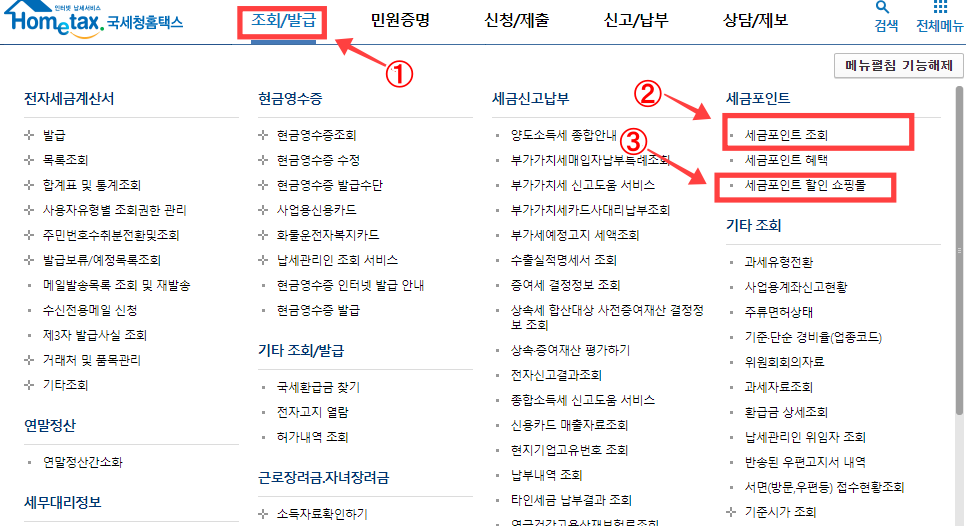 홈텍스 접속하셔서 공인인증서로그인하신후에 중앙 상단에 ①조회/발급 누르시면 오른쪽에 ②세금포인트조회 서브메뉴가 있습니다.
