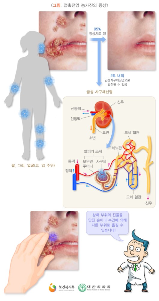 농가진(impetigo)은 주로 무덥고 습기찬 여름철에 어린이에게 잘생기는 전염성이 높은 피부 감염증입니다.