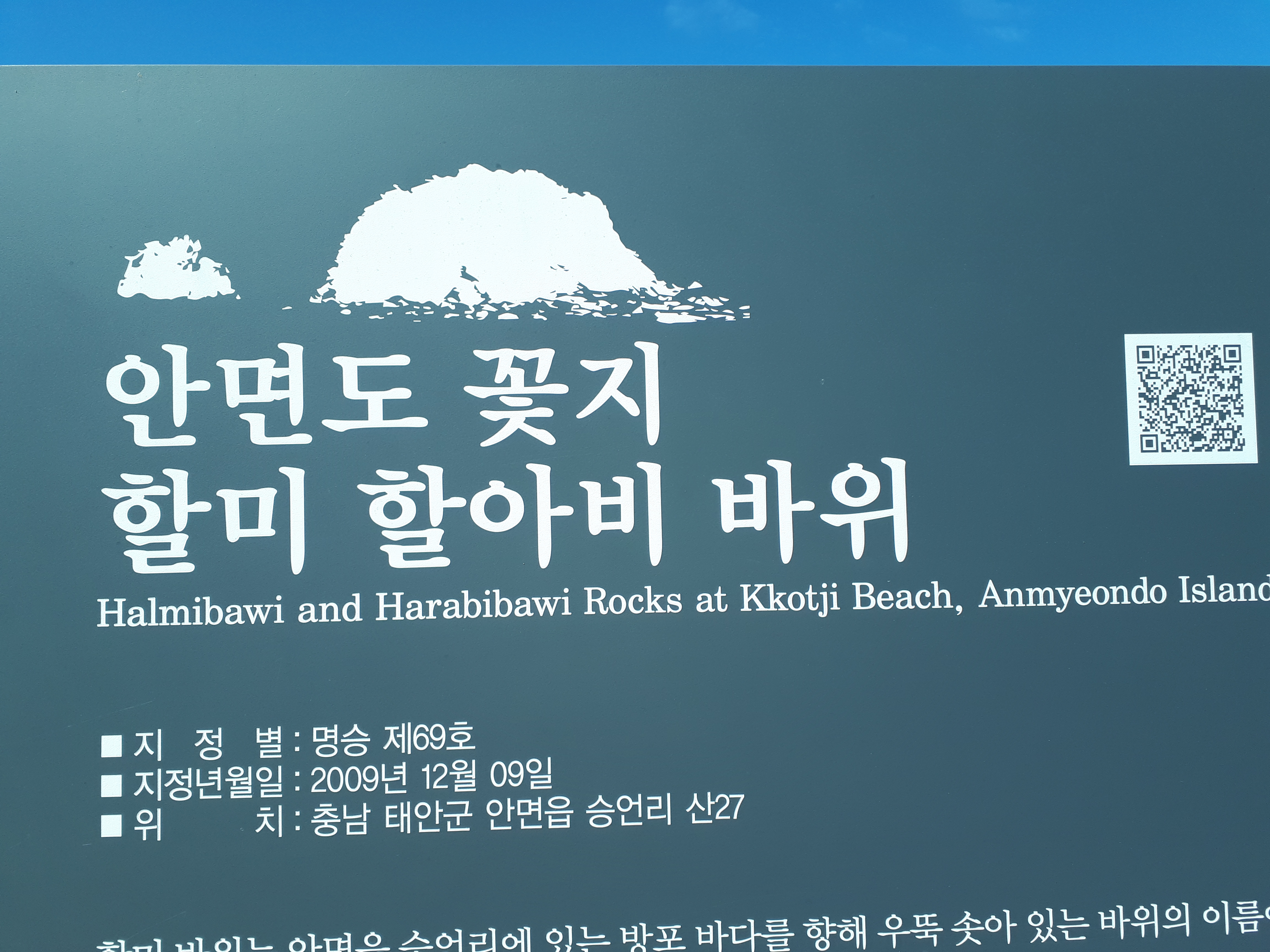 그 슬픈 전설은 신라시대 해상왕 장보고가 안면도에 기지를 두었는데, 기지사령관이었던 승언과 아내 미도는 금슬이 좋았다고 합니다. 어느날 출정나간 승언이 돌아오지 않자 바다만 바라보며 남편을 기다리던 미도는 죽어서 할미바위가 되었고, 할미바위보다 더 바다쪽으로 나간 곳에 있는 큰 바위가 할아비 바위가 되었다는 이야기라고 하네요.