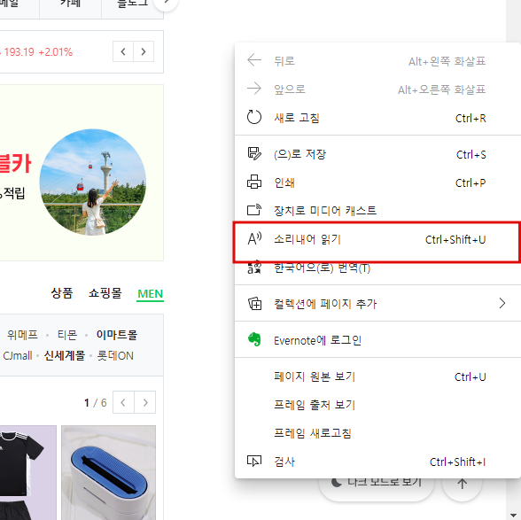 소리내어 읽기 는 웹사이트의 빈 바탕화면에서 마우스 오른쪽 버튼 누르시면 소리내어 읽기 항목이 있습니다.