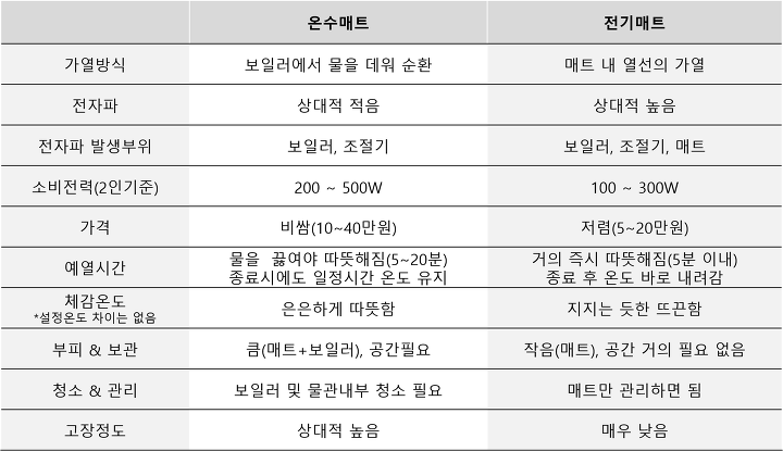 온수매트와 전기매트의 차이점은 아래표를 참조하시면 됩니다.
