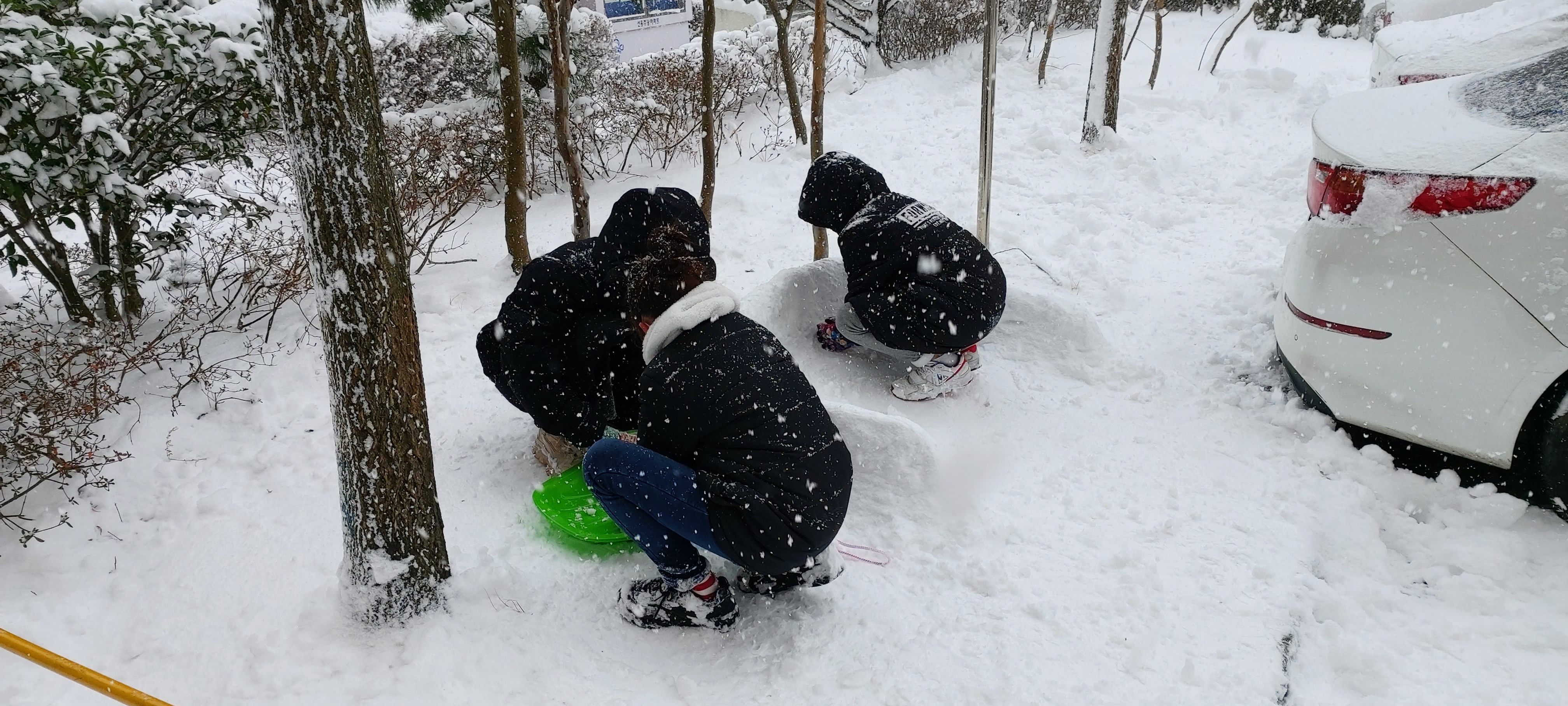 아파트에 사는 초등학생 얘들이 이글루 만들고 있네요.