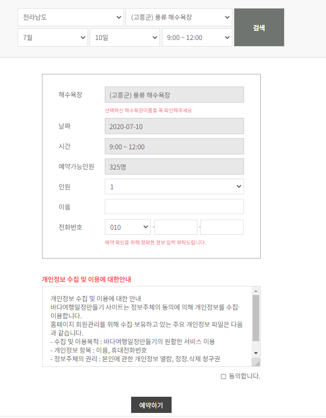 보통 해수욕장이 7월10일정도에 개장을 하더라구요. 화면의 예약 버튼을 누르시면 예약 화면으로 들어갑니다.
