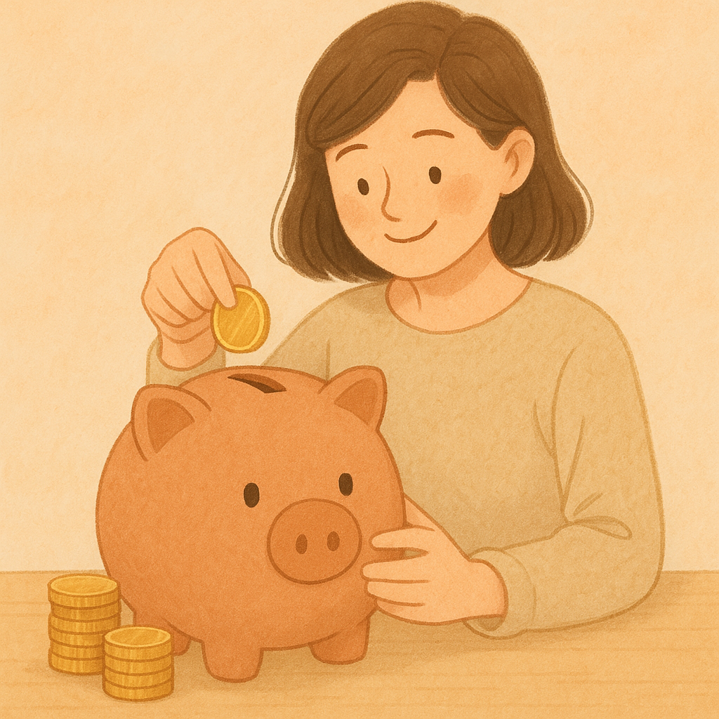 저금통에 돈을 차곡차곡 넣는 따뜻한 감성의 일러스트, 부드러운 파스텔톤 배경, 희망적인 분위기