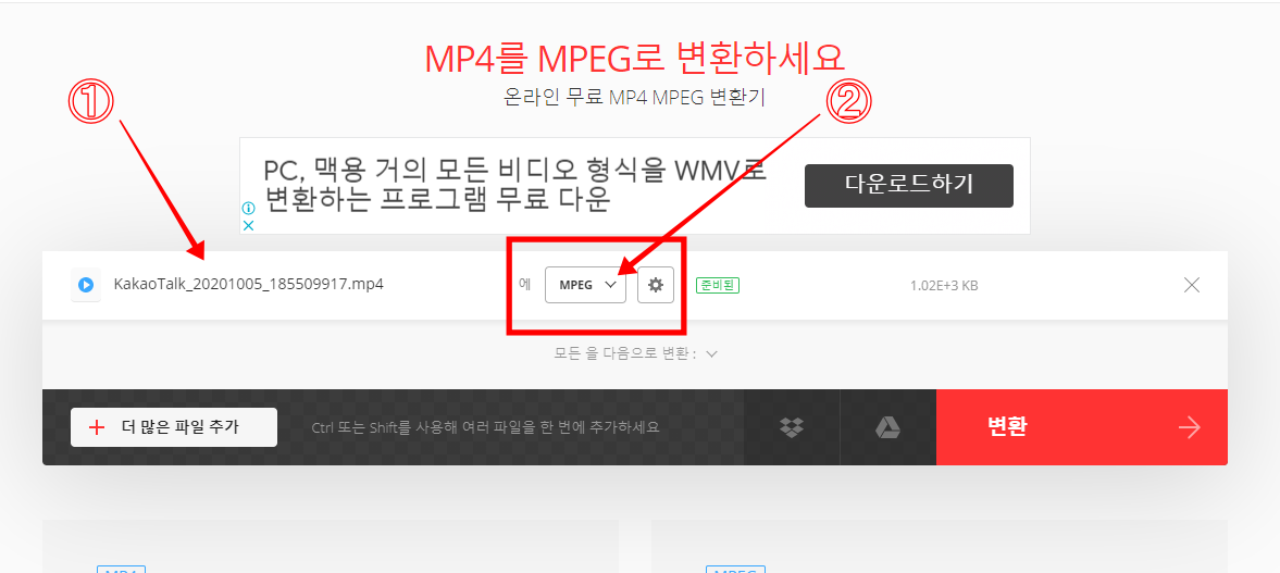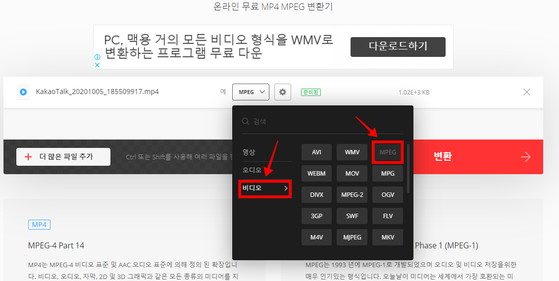 영상, 오디오, 비디오 파일형식이 있는데요. 비디오 내가 변환할 파일 형식, 즉 저의 경우에는 MPEG 파일형식 선택했습니다.