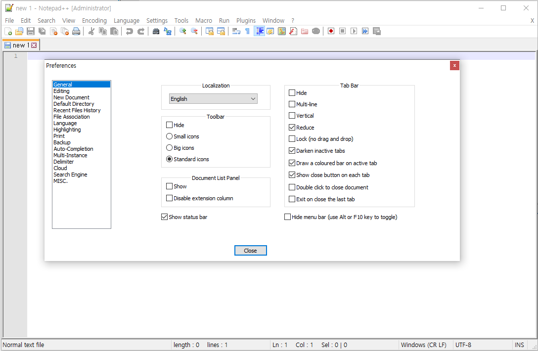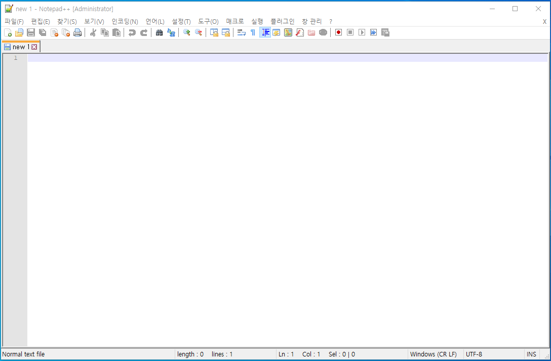 프로그램을 실행하면 아래와 같은 첫 화면이 나옵니다. Notepad++의 기본언어설정은 영어입니다. 그냥 사용해도 상관없지만, 한국어로 설정해서 사용하시면 더 편리합니다.