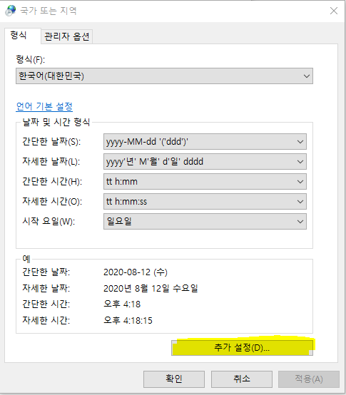 국가 또는 지역 창에서 형식의 아래 부분 추가설정을 눌러주세요.